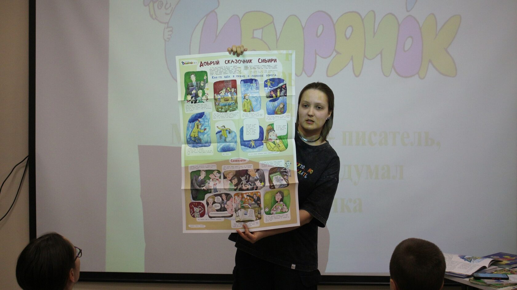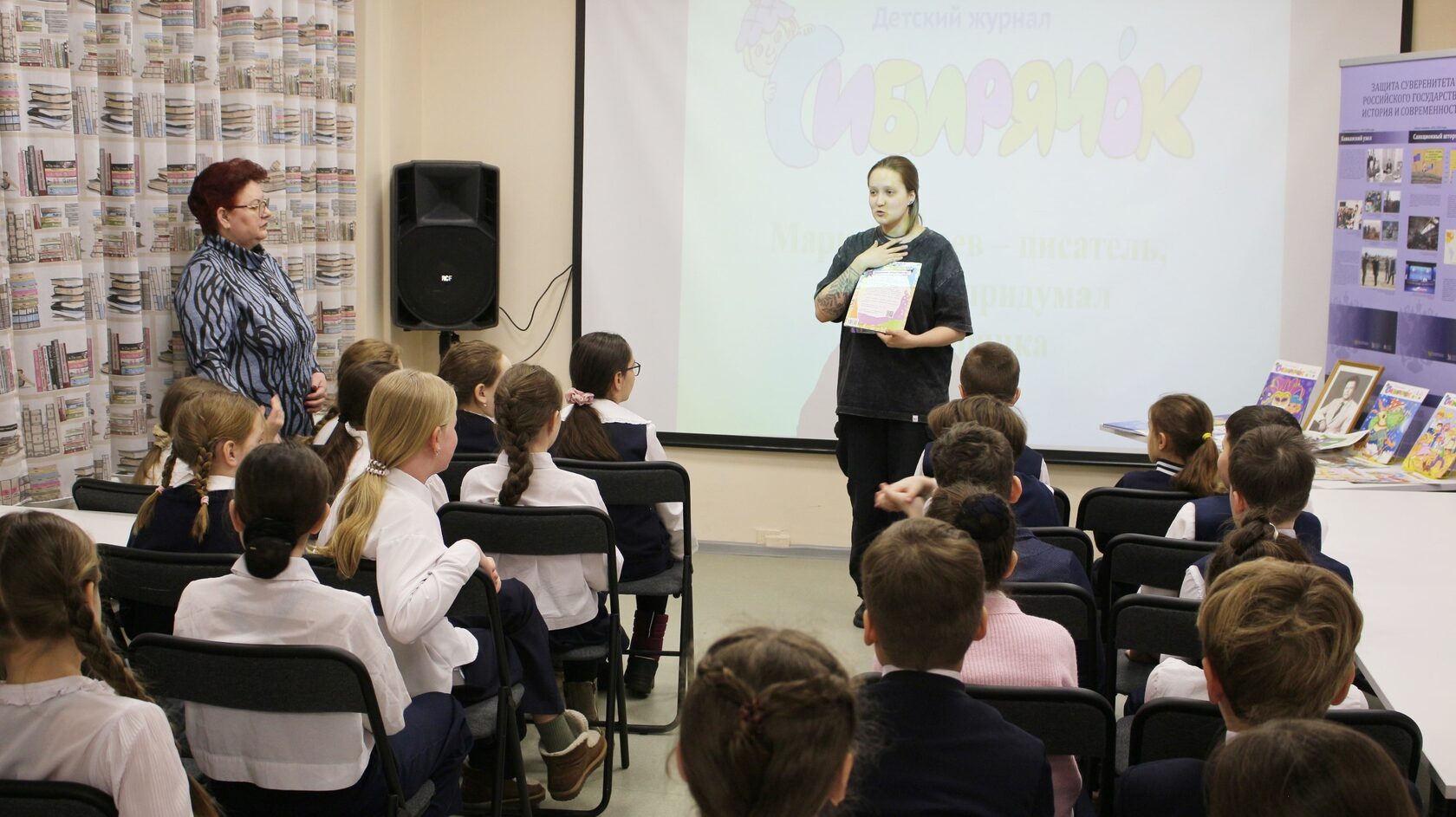 Ирина Луцкая прочитала школьникам сказки, стишки, песенки автора из книги «Марк Сергеев – писатель, который придумал Сибирячка». Потом началась живая дискуссия: дети поделились своими впечатлениями и назвали свои любимые книжки.